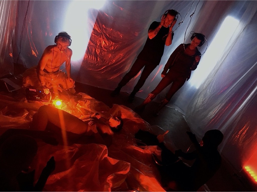 BODY???HACK!!! is a performative sound installation based on Donna Haraway’s cyborg manifesto taking place in the Livart art gallery. The installation features a tangle of synthetic tubes and moving bodies, while the text of the manifesto is being remixed live, made available to the audience through headphones.