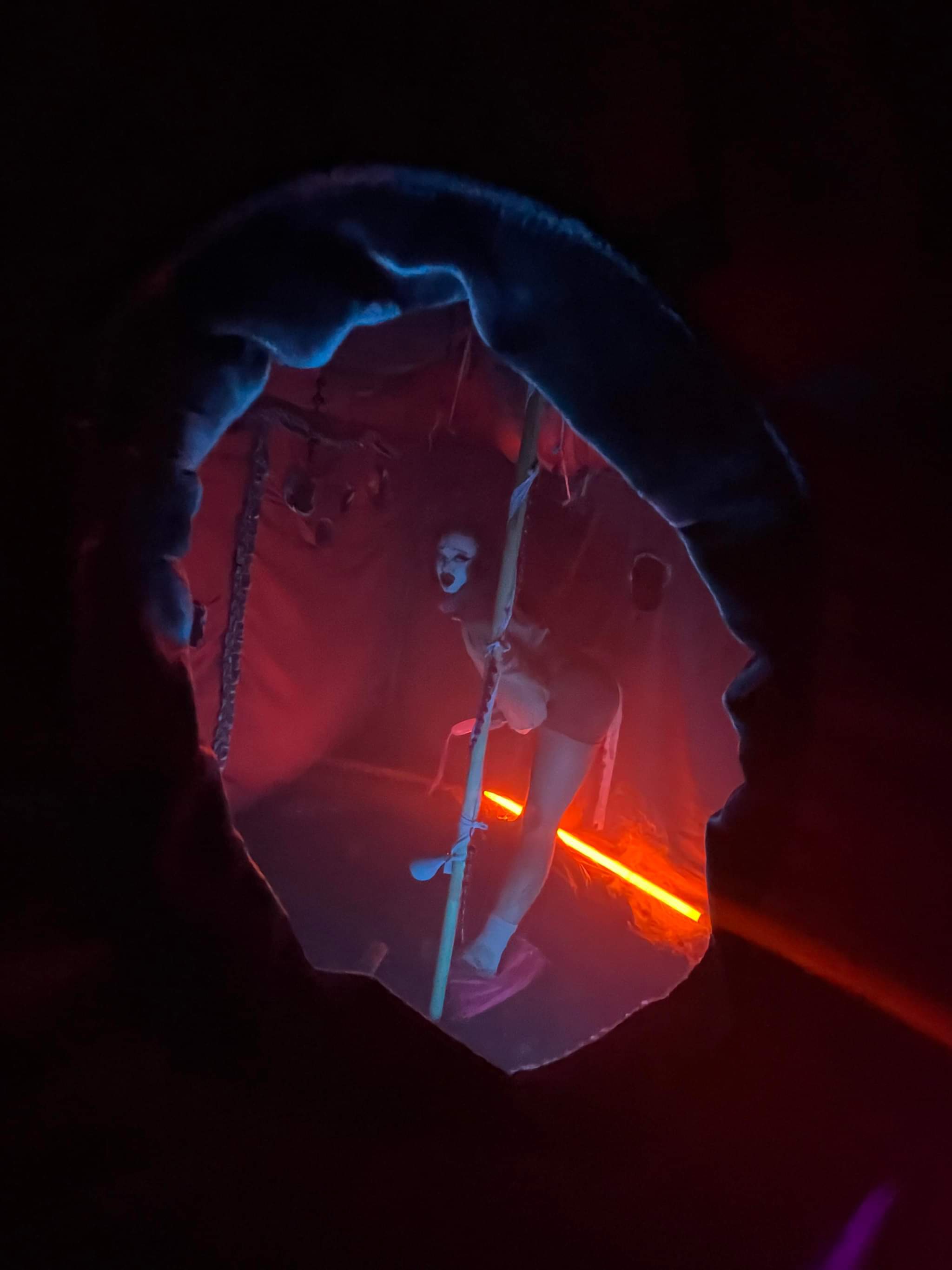 The Wide Open Peepshow is a mobile performance installation in the form of a tent, punctured with viewing holes at 360 degrees. Spectators are invited to insert their faces into the structure, transforming the tent’s surface into a living mosaic of gazes. This circular architecture generates a radially intimate space — one where watching and being watched collapse into a shared, charged encounter.